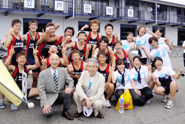 ![]() 勝利を喜ぶ京都大学ボート部クルーと赤松理事・副学長(前列右)、前川覚 ボート部長(前列左) |