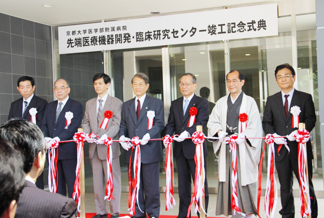 医学部附属病院では、「先端医療機器開発・臨床研究センター」の完成を記念して、竣工記念式典を挙行しました。学内外から約100名が出席し、盛大にオープンを祝いました。今回完成した同センターは、医療機器の臨床研究から薬事申請までの一連の流れを迅速かつ適正に実施し、我が国における医療機器開発のボトルネックである臨床研究に重点的に取り組む本格的な産学連携拠点となるもので、経済産業省の補助金とキヤノン株式会社からの寄附により建設されました。