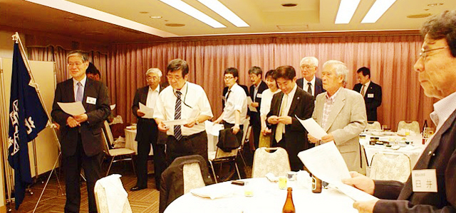 懇親会は、横内龍三 会長(法学部・昭和42年卒)の挨拶の後、小泉幸雄 前会長(法学部・昭和29年卒)の発声による乾杯が行われました。続いて、澤田昌廣 事務局長(法学部・昭和54年卒)から、今年2月に北海道京大会女性支部が設立され、この支部から6名の参加者があることが紹介されました。