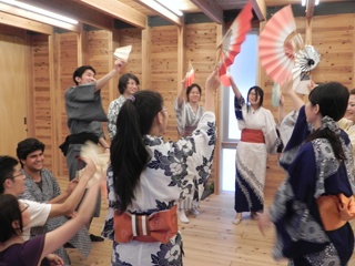 まずは、浴衣の着付けを体験しました。自分で浴衣を初めて着たという参加者が多くいましたが、初めてと思えないほど、上手に着ることができました。その後で、先生が古典日本舞踊と創作日本舞踊を実演し、スタイルの違いについて説明していただきました。説明のあと、日本舞踊で使われる「すり足」を学んだり、実際に踊ってみたりと多くの体験をすることができました。