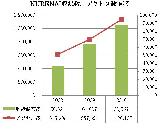 KURENAIは、2006年の公開以来、収録論文数、アクセス数とも着実に増加しており、本学の研究・教育成果を社会に発信しています。