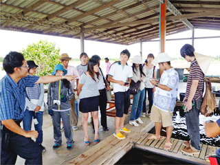 ![]() トウモロコシ畑での説明 | ![]() エビ養殖池での説明 |