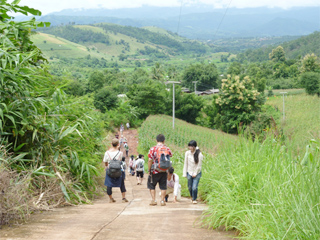 研修では、北部山地での急斜面の畑作、中部平原での緩傾斜地の畑作、デルタの近郊園芸など、農業に関する実地観察と農家に対するインタビューを行い、さらに北部インタノン山や東北部サケラート地域での熱帯林の生態系、沿岸湿地での沿岸生態系とその利用などについて学習をするとともに、さまざまな文化施設を訪問しました。また、後半の中部・東部での研修では、タイの学生も参加し交流を深めました。最終日の発表会では、タイでの経験を様々な形で発表しました。