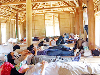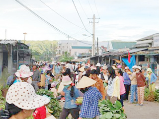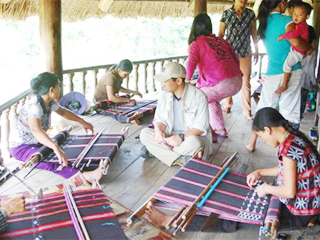 ![]() 朝5時起床で山間部の朝市へ | ![]() 伝統的織物、1本の糸が布になってゆく |