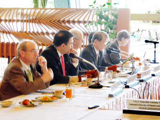 ![]() 議論に聞き入る議長と講演者 | ![]() 基調講演の一幕 |