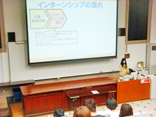 初日の12日にはIAESTE(イアエステ)京都大学学内委員会が、続いて13日にはAIESEC(アイセック)京都大学委員会が、インターンシップの特徴、また現在募集中のプログラムについて、応募手順から企業とのマッチング、費用、フォローアップまでの流れに関する講演を行いました。また、インターンシップへの参加実例や体験談が披露され、終了後には、必要な語学力、研修内容や現地での生活等についての活発な質疑応答が行われたほか、個別相談を実施しました。海外企業での研修を身近に感じながら、それぞれに応募への決意を新たにしている様子が伺えました。
