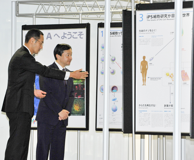 皇太子殿下は、山中伸弥 iPS細胞研究所長の案内により、会場となった同研究所玄関で中川正春 文部科学大臣や松本紘 総長らの出迎えを受けられた後、山中所長より、1階ギャラリーにてパネルによるiPS細胞研究の概要説明を受けられました。