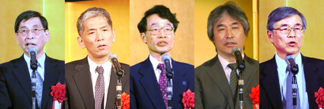 左から、岡田理事長、小屋口所長、小森研究科長、山極研究科長、池淵周一名誉教授
