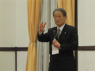 ![]() 大西理事・副学長による乾杯の挨拶 | ![]() 松本総長による開会スピーチ |