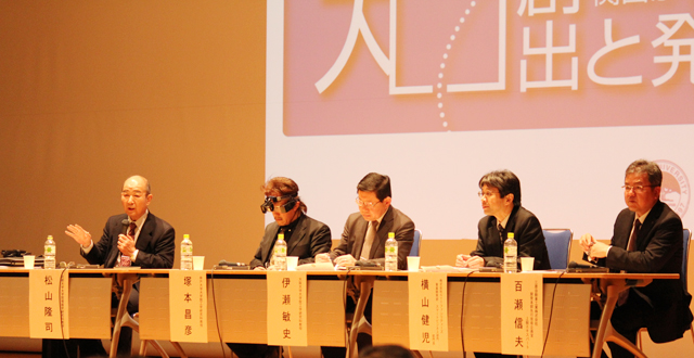 ![]() 総合討論の様子(左から司会の松山教授、神戸大学 塚本教授、大阪大学 伊瀬教授、NTTファシリティーズ 横山氏、三菱自動車 百瀬氏) | |
