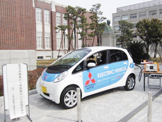 ![]() 電気自動車から家電製品への給電デモの様子 | ![]() 給電デモの説明を聞く参加者 |