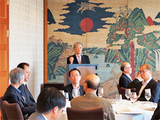 今回は、韓国総同窓会から26名、ソウル洛友会から14名の出席があったほか、金辰圭 建国大学総長の出席もありました。金會瑞 韓国総同窓会常勤副会長(工学研究科・1986年修了)の司会により進められ、韓国総同窓会の沈会長(工学論文博士・1980年)の挨拶に続いてソウル洛友会の黒田会長(経済学部・1964年卒)の挨拶がありました。