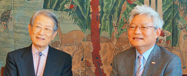 松本総長(左)と金建国大学総長(右)