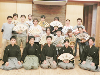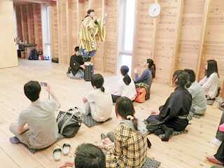 今年の演目は「柿山伏」(かきやまぶし)、そして 「神鳴」(かみなり)と「福の神」(ふくのかみ)という二つの小舞でした。実演を鑑賞した後、参加者全員で基本姿勢や狂言独特の歩き方、笑い方、「柿山伏」に登場するカラスやトビの鳴き方などを練習し、最後に練習の成果をみんなの前で披露しました。質疑応答では、参加者から多くの質問が飛び交い、参加者は狂言の知識を深めることができました。
