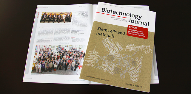 ドイツに編集部を置く国際科学誌「バイオテクノロジー・ジャーナル」(ワイリー社)で、物質—細胞統合システム拠点(iCeMS)とハイデルベルグ大学SFB873(幹細胞の維持・分化に関する共同研究センター)の合同シンポジウム「Crossing Boundaries: Stem Cells, Materials, and Mesoscopic Sciences(幹細胞、物質、メゾ科学の学際領域へ)」を特集した号「Stem Cells and Materials(幹細胞とマテリアル)」(Biotechnol J 7, 693-823; 2012)が出版されました。