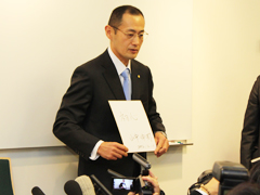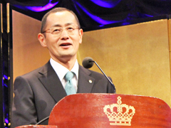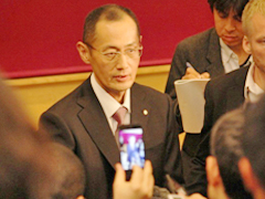 ![]() 渡された色紙に「初心」と書いて掲げる山中所長 | ![]() 昼食会で挨拶をする山中所長 |