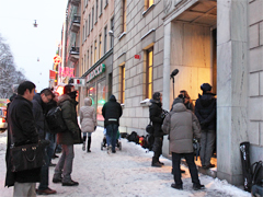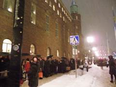 ![]() 吹雪の中、会場入りを待つ晩餐会出席者 |