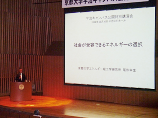 初日の20日は、宇治おうばくプラザにおいて、エネルギー理工学研究所長 尾形幸生 教授による「社会が受容できるエネルギーの選択」、化学研究所 栗原達夫 教授による「地球環境と私たちの暮らしと微生物」、防災研究所 林春男 教授による「災害に負けないしなやかな社会-防災の科学入門-」と題して特別講演会を行いました。また、19日にはプレイベントとして工学研究科の公開シンポジウム、21日には化学研究所および生存圏研究所の公開講演会を行いました。