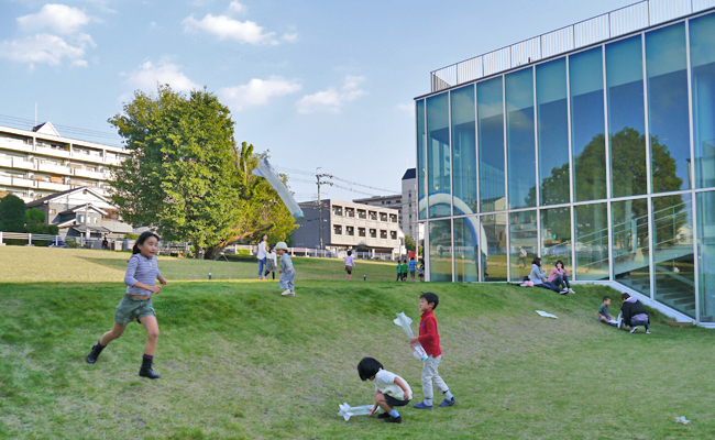 公開ラボで作った「傘袋ロケット」で遊ぶ子供たち