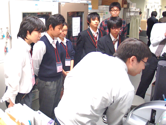 高校生は、蛍光顕微鏡を覗いたり、実験装置の説明を熱心に聞いたりするなど、細胞への興味を深めている様子でした。