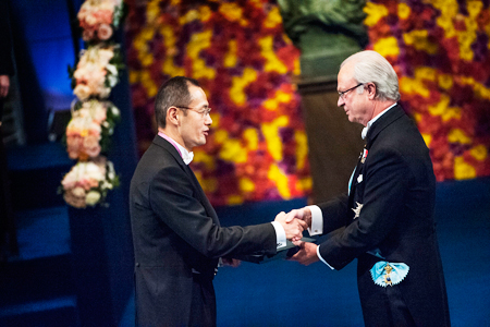 ![]() カール16世グスタフ国王からメダルと賞状を手渡される山中所長
