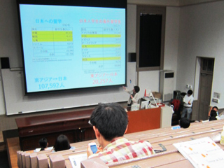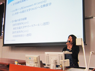 まず、国際交流センター教員等が、交換留学可能なアジア各国の学生交流協定校や、主に長期休暇期間を利用して参加できる東アジア圏における超短期留学プログラム(サマー/スプリングスクール)の紹介と、アジア留学の魅力や利点に関する講演を行いました。続いて、シンガポール国立大学への交換留学経験者と中国・北京大学の交換留学経験者が、留学先での学習環境・異文化交流等について話をし、アジア留学や英語学習に対するアドバイスを伝えました。最後に、国際留学センターの教員が励ましの言葉を贈りました。参加者はそれぞれ留学への道筋を具体的に思い描いているようでした。