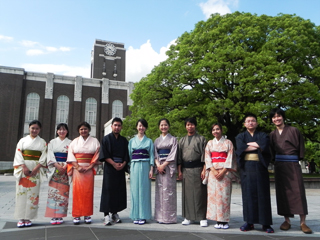 「きずな」の6月のイベントは、京都大学学生団体 京都着物企画のご協力のもと「着物着付け教室」を開催しました。参加者は着物の種類や着付けについての説明を受けたあと、着付けに挑戦しました。参加者全員、着付けは初めてでしたが、上手に着ることができました。その後、京都大学キャンパス内を散歩しました。
