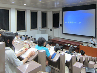国際交流センター教員が、海外生活の中で起こりうる様々な安全面・健康面・精神面の危険性や犯罪事例とその対策について講演を行い、安心で快適な留学・海外研修に臨むため、安全に関する正しい知識と情報収集の大切さや保険加入の重要性を伝えました。大学間学生交流協定校への交換留学や、短期留学プログラムへの参加を予定している本学学生を中心に、会場に集った64名の参加者は、「国際交流安全ガイド(渡航編)」を片手に、講演に聞き入りながら、リスクの実態を理解するとともに、安全意識を高めることができました。