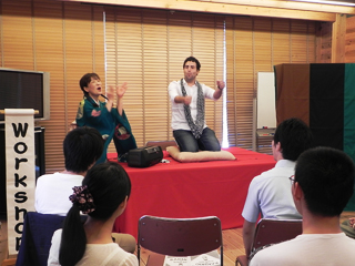 ![]() ワークショップで小咄を披露する参加者 | ![]() みんなで集合写真 |