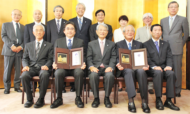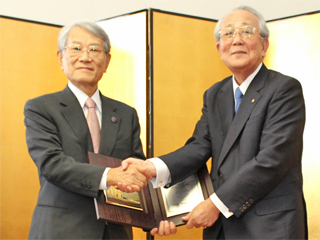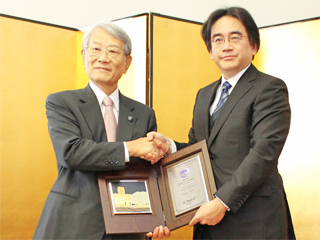 ![]() 山内相談役の代理の岩田社長(右)に名誉フェローを授与する松本総長(左) |