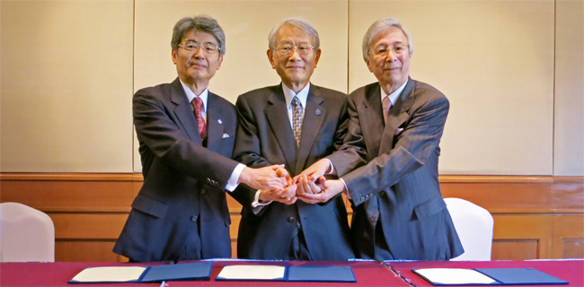 調印式で握手を交わす、松本総長(中央)、平野総長(左)および福田学長(右)