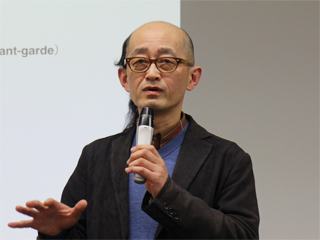 吉岡教授は、しばしば人を絶句させる表現や行為を用いることもある「前衛芸術(アヴァンギャルド・アート)」について、前衛とは何か、芸術とは何かという哲学的なアプローチや事例も交えて講演を行いました。吉岡教授の話を来場者は興味深く聞き、講演終了後には質疑応答が活発に行われました。