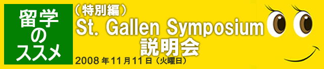 | 11月11日(火曜日) 12時10分~12時50分 | St. Gallen Symposium説明会 毎年5月にスイスのSt.Gallenで開催されるシンポジウムには、世界の指導者、学生が集まり、グローバルな課題について議論します。 このシンポジウムへの参加学生の航空運賃とすべての滞在費は主催者St. Gallen大学が負担します。今般、主催者であるSt. Gallen大学からSebastian Kress氏が来日し、来年のシンポジウムについて京大生のための説明会を開催します。本年5月のシンポには本学学生も参加しました。あなたも説明会に参加し、来年5月のシンポジウム参加をぜひ目指してください。 |