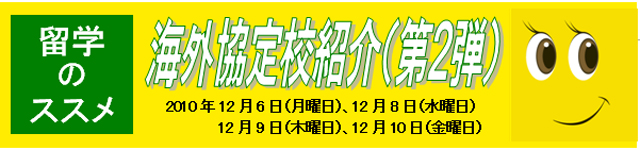 今回の案内は「海外協定校紹介」。6月に続いての第2弾で、京都大学で学ぶ協定校からの交換留学生や、その協定校に実際に交換留学をしていた京都大学の先輩たちが、コース履修や生活事情まで、留学のあれこれを熱く語ってくれます!将来交換留学を目指したい方、気軽にご参加ください!