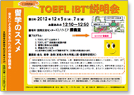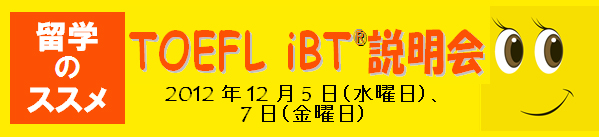 今回の留学のススメはTOEFL iBT説明会です。人間・環境学研究科の金丸敏幸先生を講師としてお招きし、TOEFL iBTの概要から、各セクションの紹介、対策方法までを二日間に渡ってご講演いただきます。