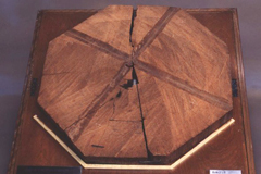 材鑑調査室は、材鑑やさく葉標本の収集をはじめ、内外の大学、研究所、諸機関との材鑑交換を積極的に行っています。現有材鑑数は17,469個(178科、1,131属、3,617種)、永久プレパラート数は9,563枚です。写真は、法隆寺五重塔心柱の一部 (ヒノキ)で、これは年輪数351、推定樹齢455年以上、A.D.241~591年(弥生時代~飛鳥時代)に相当しています。このような歴史的建造物由来の古材標本は322点にのぼり、研究用に利活用される貴重な資料となっています。