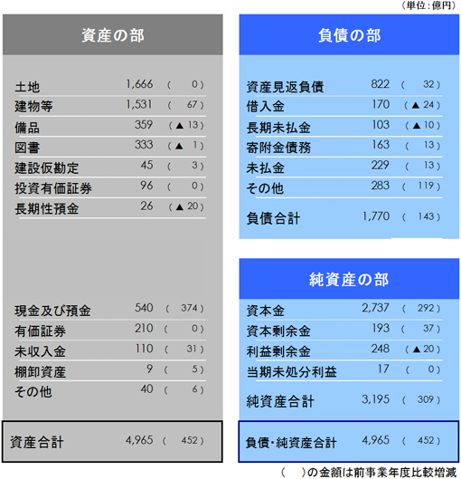 資産の合計は、4,965億円で前事業年度より452億円増加しております。主な増加の要因としては、施設整備事業として行った桂キャンパス総合研究棟 III (物理系)やメディカルイノベーションセンター棟の新営による建物等の増加と、平成24年度補正予算による産学共同の研究開発による実用化促進(大学に対する出資事業)のための資金交付により現金および預金が増加したことによるものです。