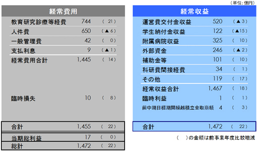 費用の合計は、約1,455億円で、前年度より22億円増加しております。主な増加の要因としては、補助金の増加や施設の整備による教育研究診療等経費の増加によるものです。