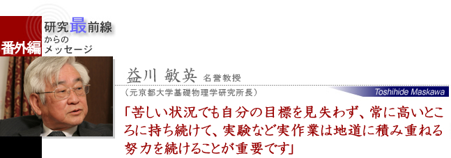 益川:実際に研究をしていると、本筋とは違う、意に沿わないことをしなければならないこともままありますが、そんな苦しい状況でも自分の目標を見失わず、常に高いところに目標を持ち続けて、実験など実作業は地道に積み重ねる努力を続けることが重要です。あと、友人や先輩などと自由に議論を交わすことも大切ですね。