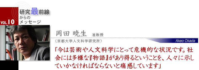 このような音楽に対する鋭い分析が可能になったのは、ひとつには岡田准教授の「音楽を人文科学のひとつとして」捉えるという一貫した姿勢がもたらしたものと言えそうだ。そして人文科学の研究者には覚悟が必要、とも言う。音楽学の研究をしていると言うと「そんなものに何の意味があるんだ」という目で見られることが多く、常に後ろめたさの意識がついて回り、それに対して「この研究は絶対に意味がある」という理論武装をしてきた。岡田准教授は「音楽も含めた人文科学・社会科学の本当の意味というのは、社会に迎合しそのニーズに応じた発信をするのではなく、既成の社会に対していかに有効な挑戦状を突きつけられるか、に尽きるだろうという気持ちが強いです。社会の常識や約束事というものに対して、別の次元での可能性を絶えず示し続けること、社会の趨勢というものに対してちょっと距離を置いて見ることができるような社会観なり人生観を人々に指し示すことにあると思うんです」と熱っぽく語る。近年、人々がひとつの方向に一斉に流され、そこから外れる者を排除しようとする風潮が強まっていることに対しても、強い危機感を覚えている。