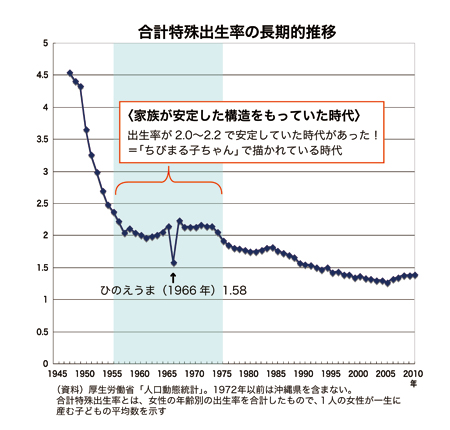 戦後、日本の出生率は1950年代と1970年代の2度、低下している。「この間の20年ほどは、合計特殊出生率がほぼ2.0、すなわち一夫婦あたりの子供の数が二人と、安定した時期です。」図に水色で示したのが、その安定した時期だ。「家族の姿は「昔から変わらない」とも、反対に「変化し続けている」とも言われますが、〈安定した構造をもっていた時代〉と〈変化した時代〉とに、はっきり区別できるのです。」
