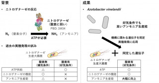 研究成果 公開日 2022年03月17日 酸素に弱いニトロゲナーゼを有酸素条件でも機能させるための重要因子を発見 -化石燃料を必要としない脱炭素社会の基盤形成に向け、空中窒素の固定を介した生物学的アンモニア生産へ期待-