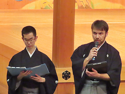 開演に先立ち、本学能楽部観世会による「見どころ説明」があり、能・狂言の面白さ、見どころを英語訳を交えながらわかりやすく説明しました。