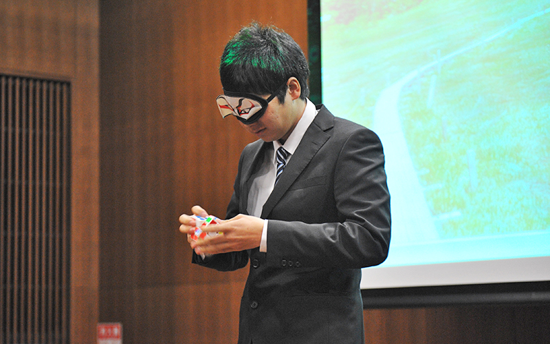 さまざまな分野で活躍する学生がいる中、各受賞者によるプレゼンテーションで大いに盛り上がったのが、ルービックキューブ世界大会で2位となった受賞者、矢内拓さんによる実演。目隠しをした状態で3×3×3キューブを揃える演技に、山極壽一 総長や理事も大絶賛でした。