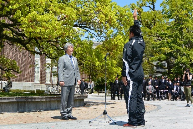 アメリカンフットボール部の学生による力強い選手宣誓や応援団による演舞演奏が披露されるなど、山極総長や川添理事・副学長、また多くの学生・教職員が見守る中盛大に開催されました。