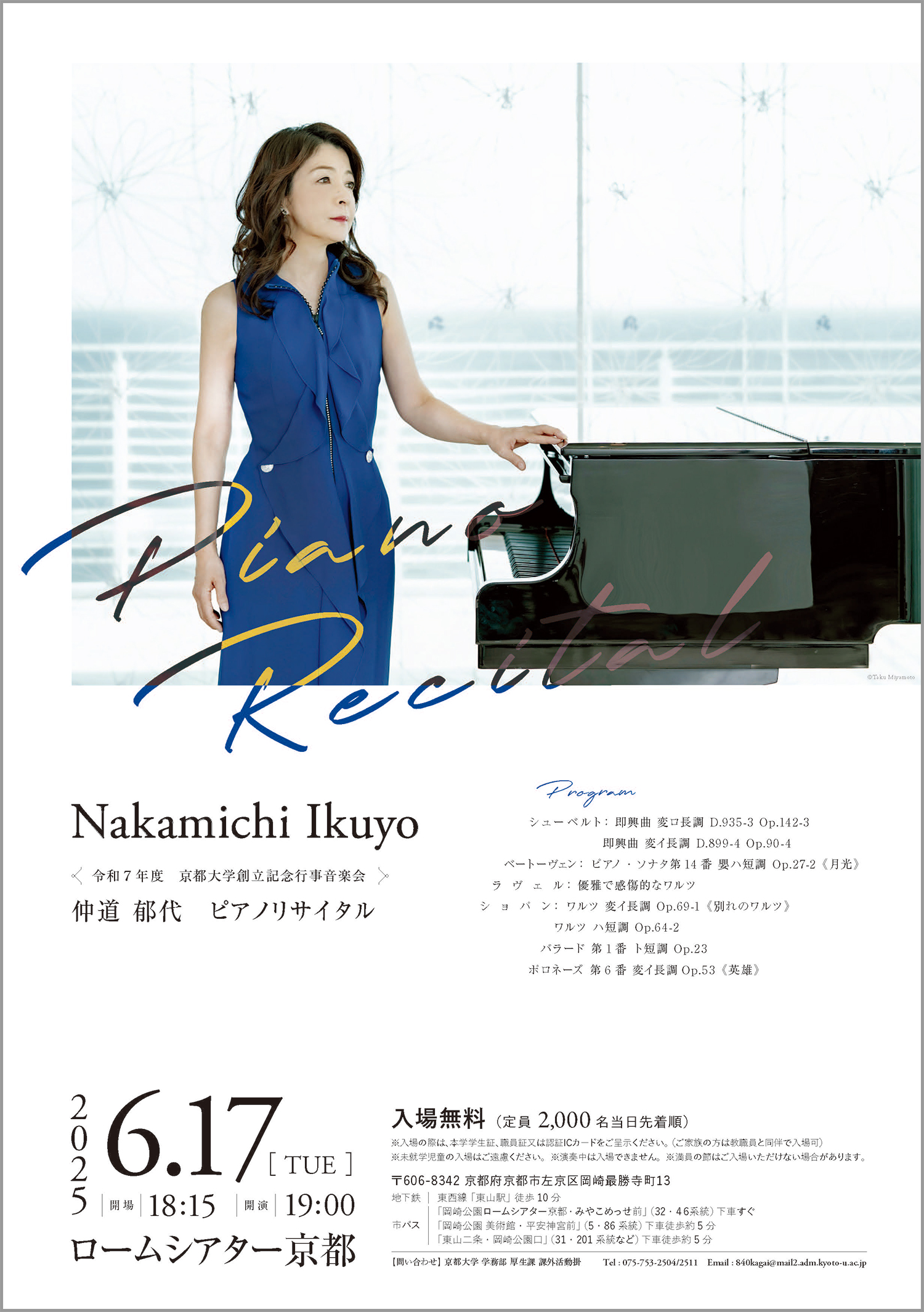 本学の創立記念行事として、毎年「京都大学創立記念日(6月18日)」前後に、著名な音楽家等を招き、「音楽会」を開催しています。また、1956(昭和31)年より開催しており、今回で67回目となります。