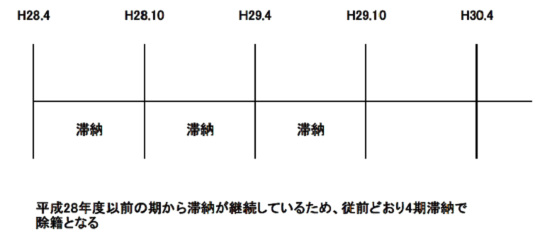 また、平成28年度以前から引き続く滞納分が完済されていない場合は、4期滞納で除籍となります。(以下参考例)