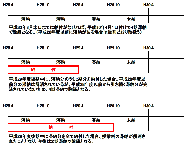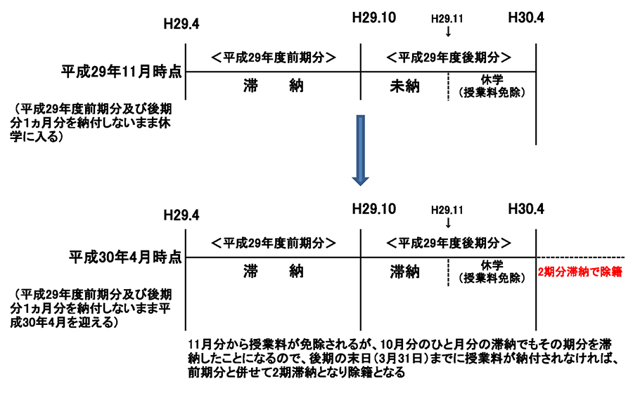 平成28年度から引き続いて授業料の滞納がある場合は当該滞納分を完納するまでは従前通り4期滞納で除籍となります。また、平成29年度以降に平成28年度以前の期から継続する授業料滞納分が完済した後に新たに授業料を滞納した場合は、授業料2期滞納で除籍となります。