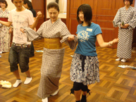 最初に、ご指導してくださった坂東流の坂東緋紗先生とお弟子さんに4曲を披露していただき、そのしなやかで素晴らしい舞踊に参加者は魅了されました。その後、実践にはいり「祇園小唄」と「黒田節」の2曲を練習しました。先生とお弟子さんのご丁寧なご指導のもと、参加者達は動きをいちはやく覚えようと一所懸命でした。日本舞踊が初めての参加者がほとんどでしたが、初めてと思えないほど2曲とも上手に踊れました。