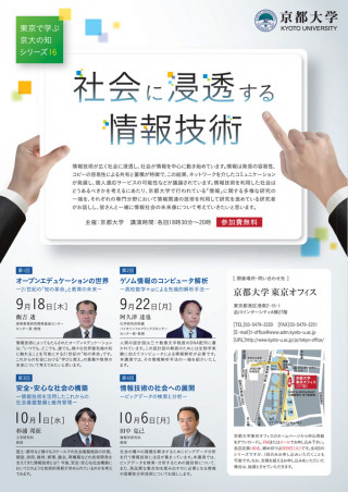 情報技術が広く社会に浸透し、社会が情報を中心に動き始めています。情報は発信の容易性、コピーの容易性による共有と蓄積が特徴で、この結果、ネットワークを介したコミュニケーションが発展し、個人適応サービスの可能性などが議論されています。情報技術を利用した社会はどうあるべきかを考えるにあたり、京都大学で行われている「情報」に関する多様な研究の一端を、それぞれの専門分野において情報関連の技術を利用して研究を進めている研究者がお話しし、皆さんと一緒に情報社会の未来像について考えていきたいと思います。